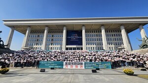 [데일리굿뉴스] 양예은 기자 = "우리 자녀와 한국교회, 대한민국이 위험합니다!"거룩한방파제 통합국민대회가 12일 서울 여의도 국회의사당 본관 계단 앞에서 기자회견을 열고, 정부와 국회가 추진 중인 포괄적 차별금지법 제정 및 성평등 정책 일체를 즉각 중단할 것을 촉구했다.거룩한방파제 측은 성명서를 통해 "정부와 여당이 포괄적 차별금지법의 취지를 구현하는 각종 법제화 시도를 전방위적으로 추진하고 있다"며 "이는 자유민주주의 기본질서를 훼손하고 헌법이 보장한 신앙·양심·표현의 자유를 침해하는 행위"라고 주장했다.특히 최근 ▲2025 인