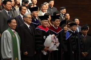 [데일리굿뉴스] 김승균 기자 = 농촌 계몽과 지역사회 발전에 기여한 윤명한 장로(96세‧남원신흥교회 원로)가 한일장신대(총장 황세형) 명예신학박사를 받았다. 11월 20일(목) 오전 예배당에서 열린 제15회 명예박사 학위수여식에는 윤명한 장로와 윤신근 박사(윤신근동물병원 원장) 등 가족, 교계 인사, 동문, 교직원과 재학생 등 400여명이 참석했다. 윤장로는 6·25 한국전쟁 발발 이틀 후 군에 입대했고, 군 복무중 총상을 두 번 입었으나 기적적으로 살아남은 것을 계기로 일생을 하나님의 일을 하기로 결심했다. 제대 후 농촌에 남아