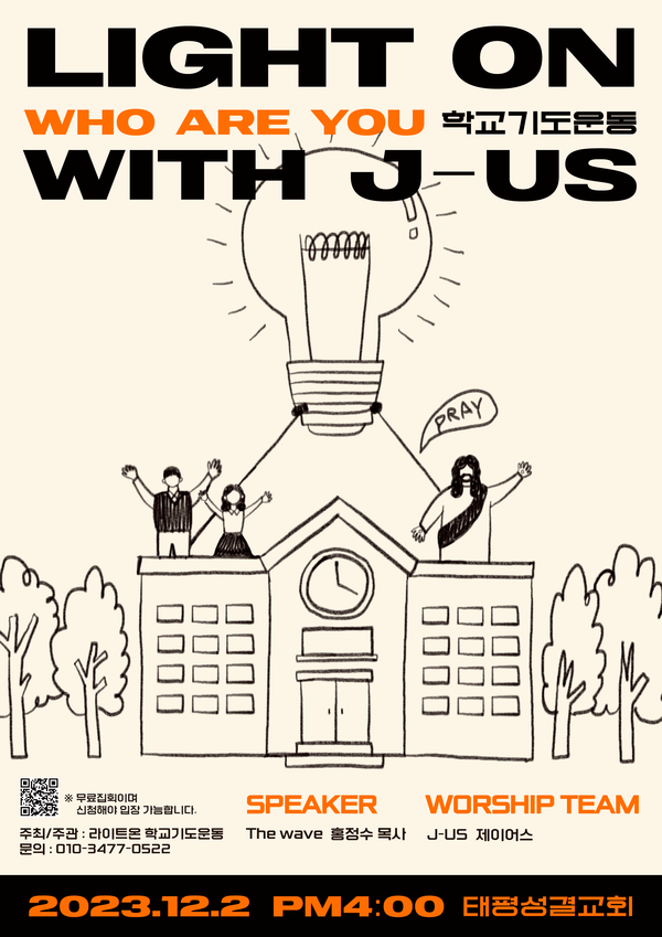 [데일리굿뉴스] 양예은 기자 = 제7차 'LIGHT ON with J-US 학교기도운동 집회'가 내달 2일 오후 4시 대전태평교회에서 개최된다.