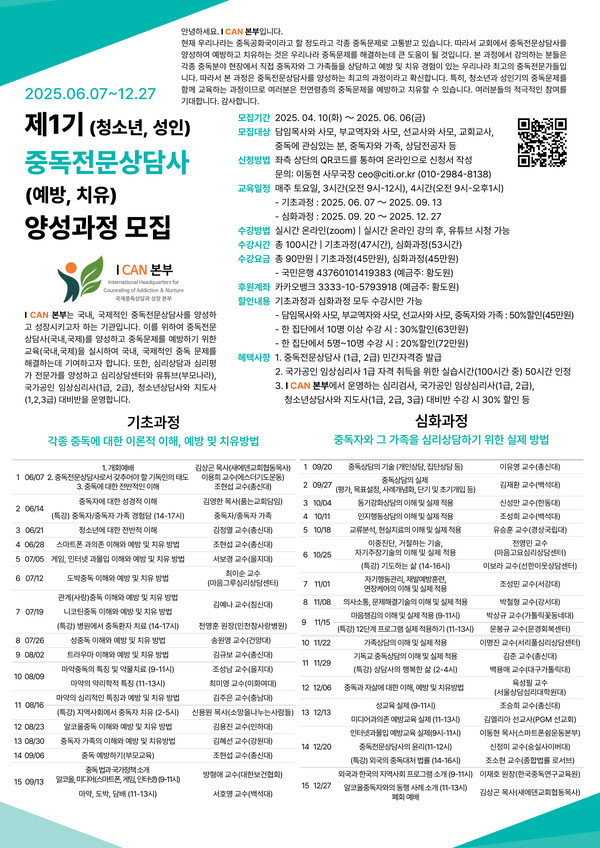 I CAN 본부는 각 교회 안에 회복 공동체를 세울 동역자를 양성할 계획이다. 이에 내달 7일부터 '제1기 중독전문상담사 양성과정'을 시작한다. 조성남 서울시마약관리센터장을 비롯해 천영훈 인천참사랑병원장, 이재호 한국중독연구교육원장, 신성만 한국중독심리학회장 등 국내 중독 분야 최고 권위자들이 강사로 나선다. 기초과정에서는 중독 실태와 치료법을, 심화과정에서는 중독자 및 가족 상담 기법 등을 교육한다. 오는 6월 6일까지 목회자, 사모, 선교사, 중독자 가족 등을 대상으로 수강생을 모집하고 있다.